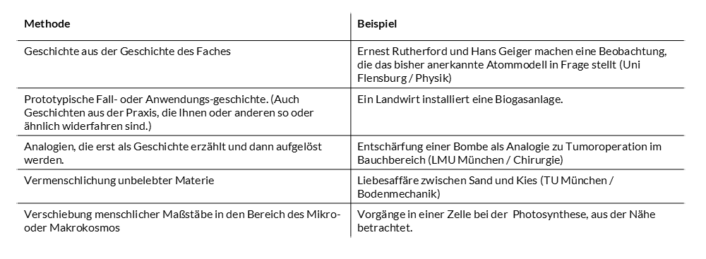 In langen Jahren eigener Erzählpraxis und als Ergebnis vieler hochschuldidaktischer Seminare haben sich fünf Ansätze herauskristallisiert, die fast jedes Thema in eine gut erzählbaren Geschichte fassen können.